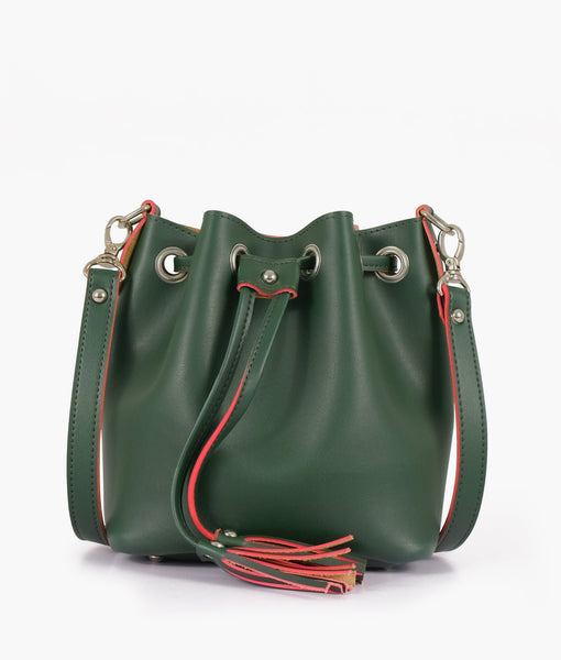 Width: 9 inchesHeight: 9 inchesDepth: 5.5 inchesOne main drawstring compartment.Adjustable and detachable shoulder strap.Material: Faux leather.